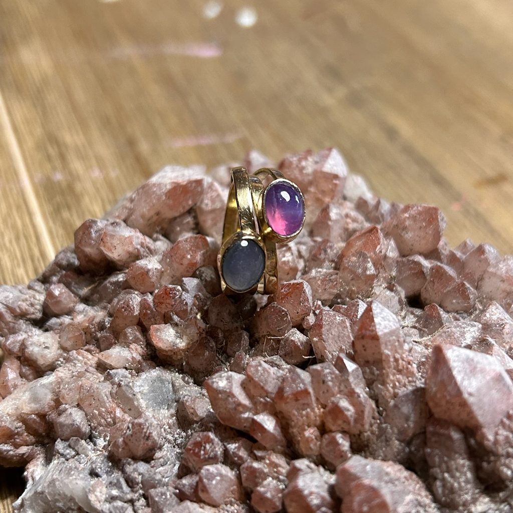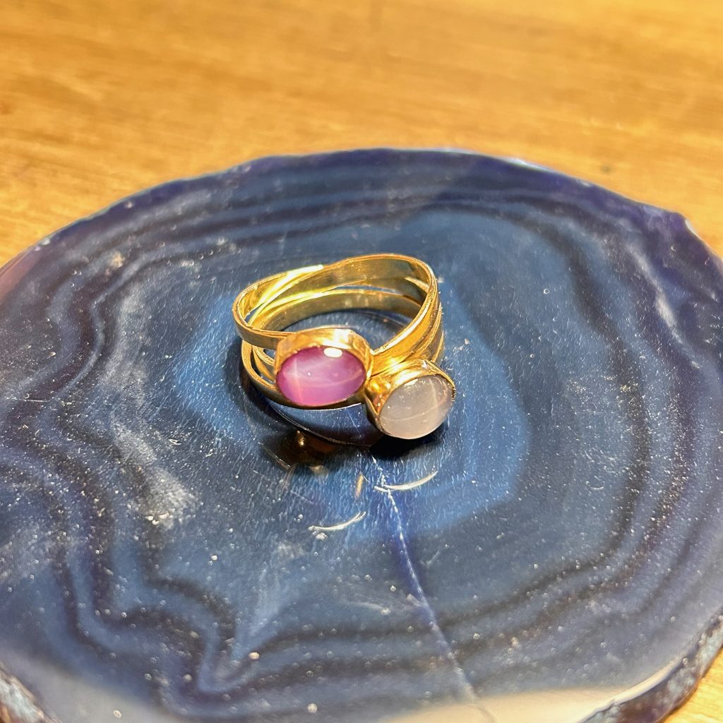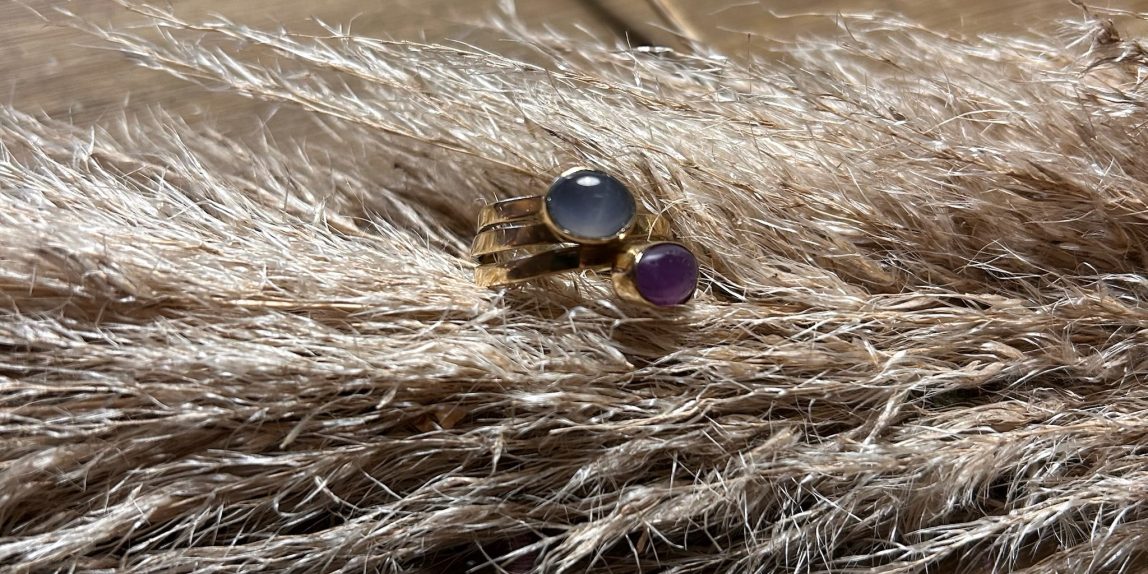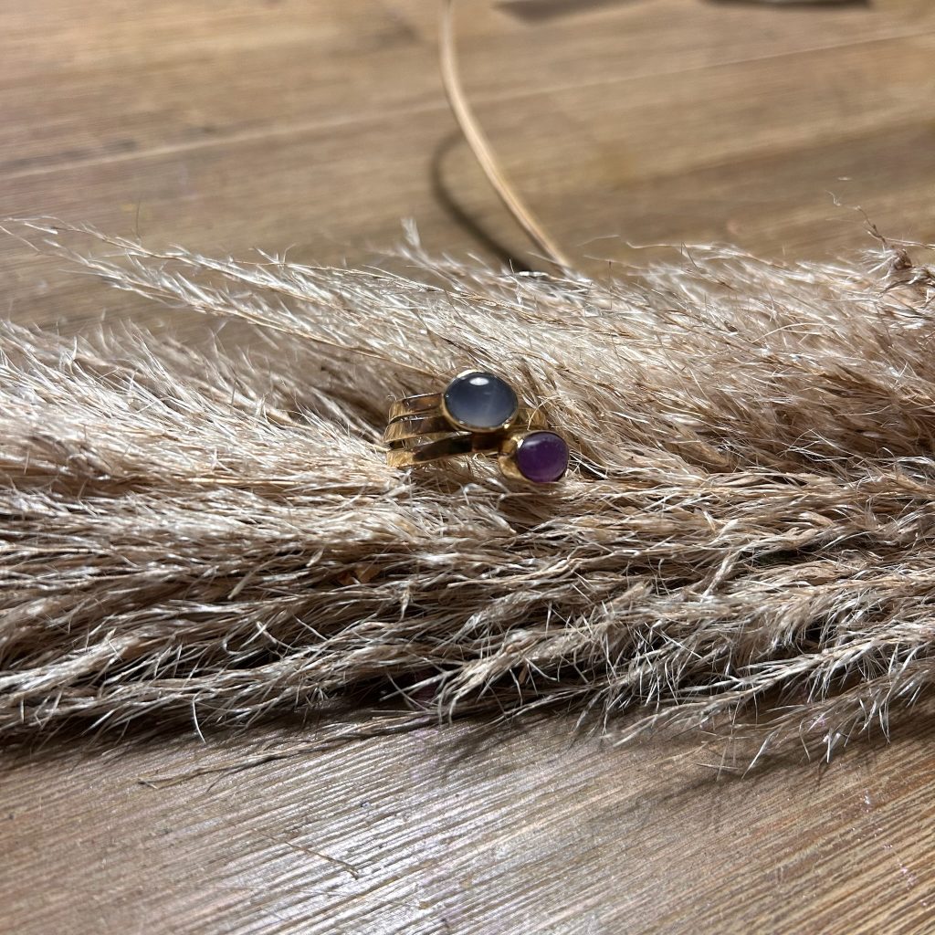 In opdracht: gouden wikkelring met amethist en maansteen In opdracht gemaakt: gouden wikkelring met amethist en maansteen. Volledig vervaardigd uit oude sieraden van de klant.